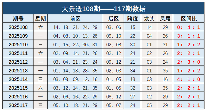大乐透第2025117期出奖号统计:前区05、10、18、21、29,后区05、07。前区跨度24,龙头05,凤尾29,区间比比2:2:1。