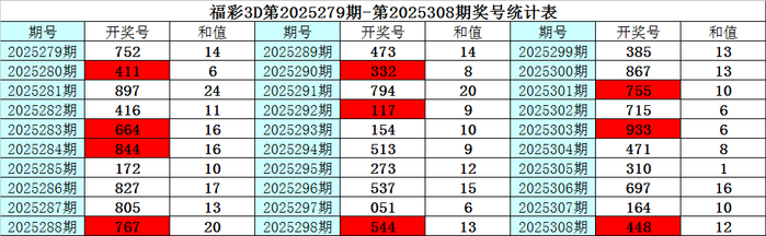 上期回顾:福彩3D第2025308期奖号为:448,其中奖号组选类型为:组三,奇偶比为0:3,大小比为1:2,012路比为0:2:1,和值为16,跨度为4。